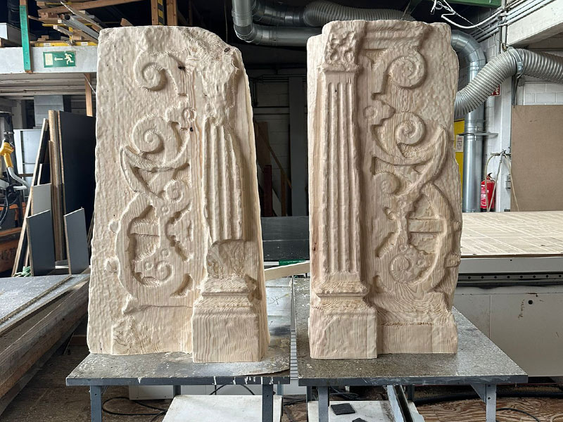 Mithilfe eines hochauflösenden 3D-Scans wurden alle Details des historischen Portals digital erfasst und präzise modelliert. Auf dieser Grundlage rekonstruierte eine Bellheimer Schreinerei das gesamte Portal mit modernster Frästechnik – aus Holz, maßstabsgetreu und ressourcenschonend. Die Replik steht heute in der Nähe des ehemaligen Schlossstandorts und vermittelt anschaulich die kunstvolle Gestaltung und architektonische Wirkung des Originals.